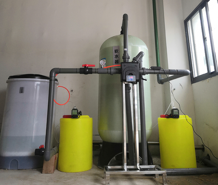 由于水的硬度主要由鈣、鎂形成及表示,故一般采用陽離子交換樹脂(軟水器),將水中的Ca2+、Mg2+(形成水垢的主要成份)置換出來,隨著樹脂內(nèi)Ca2+、Mg2+的增加,樹脂去除Ca2+、Mg2+的效能逐漸降低。
