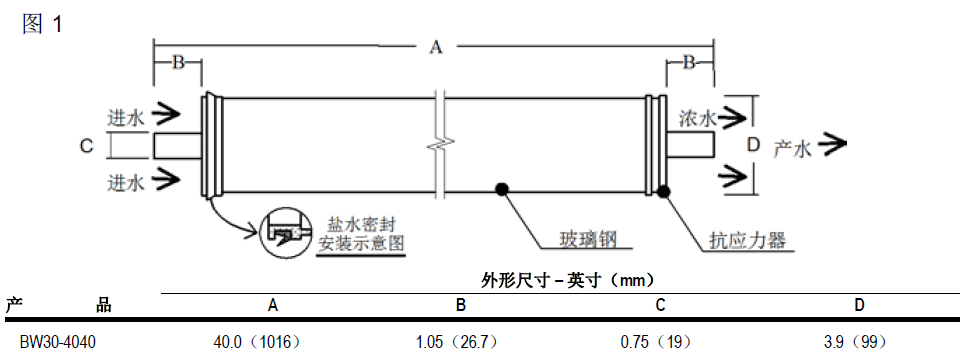 2. 陶氏反滲透膜元件BW30-4040配公稱內徑4.0寸的壓力容器。